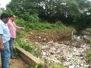 El director regional de salud de Herrera, Dr. Luis Pérez y el técnico Edison Baúle, de saneamiento ambiental regional, en la mañana de este lunes inspeccionaron la quebrada Negro en el corregimiento de Llano Bonito, que mantiene acumulación de basura en los canales naturales  fluviales.