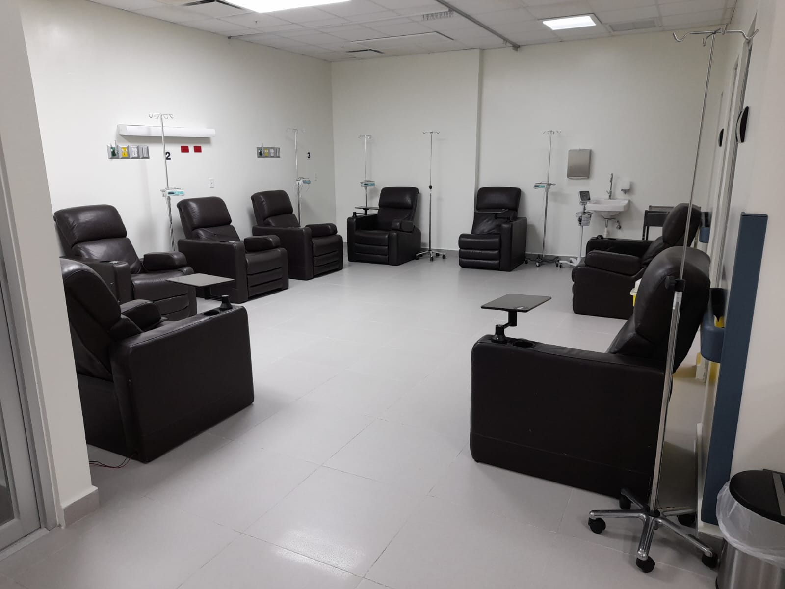 El área cuenta con 12 sillones y una cama para la aplicación de quimioterapias intravenosas, área de consulta, salas de espera y de citas, estación de enfermeras, farmacia, insumos y equipos para la preparación de las quimioterapias.